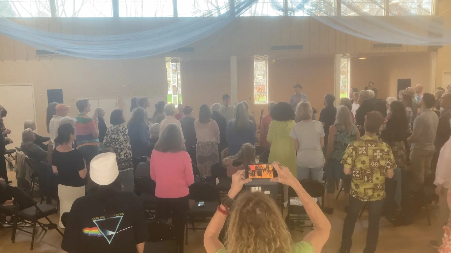 I lead our Joyful Voices Chorus community choir, our drop-in All In Song Circle and our free pop-up choirs, and I’m co-organizer of Singing Resistance Marin. For 2 1/2 years during the pandemic I was the chief cook and bottle-washer of SingOnline.org and the SingOnline.org Song Circle, where through the miracle of free software, unlike on Zoom, everyone can see and hear every word sung by everyone in the circle online, with no delay.