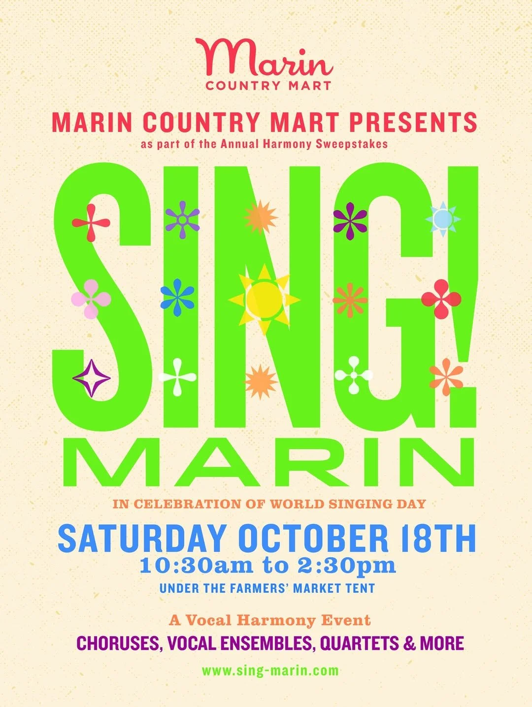 Saturday, October 18th, 11:30-12:00 outdoors under the big tent at Marin Country Mart (Larkspur Landing), part of the SingMarin event during the fabulous farmers’ market!