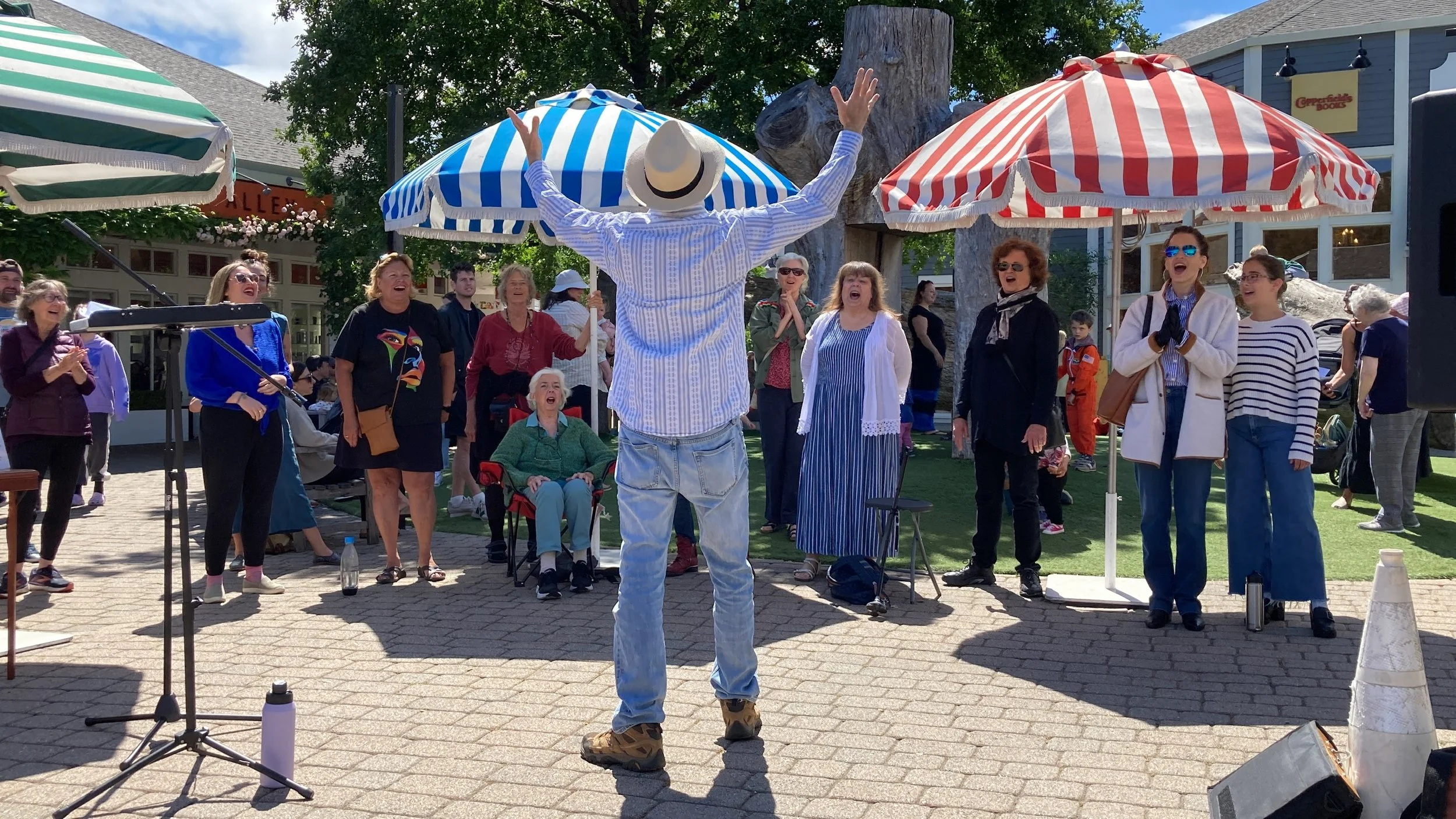 The Sing With Marv pop-up choir at Marin Country Mart on August 26, 2023 singing Debbie Nargi-Brown’s Be Open.